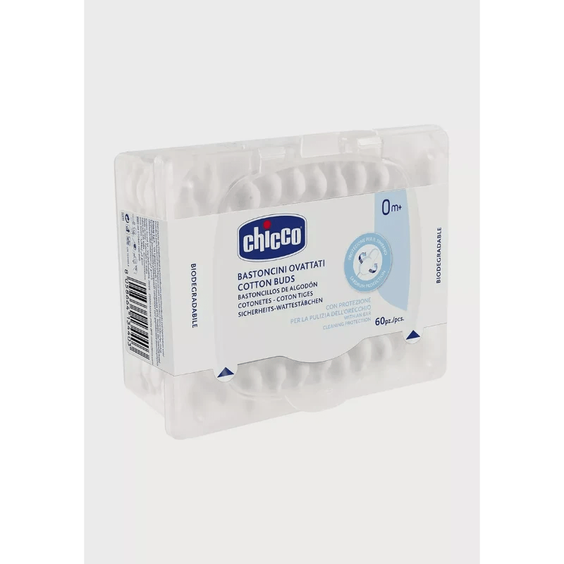 أعواد قطن أذن من شيكو – 60 عود. نهايات ناعمة وآمنة للتنظيف اللطيف. مثالية للعناية ببشرة الطفل. تسوق الآن.